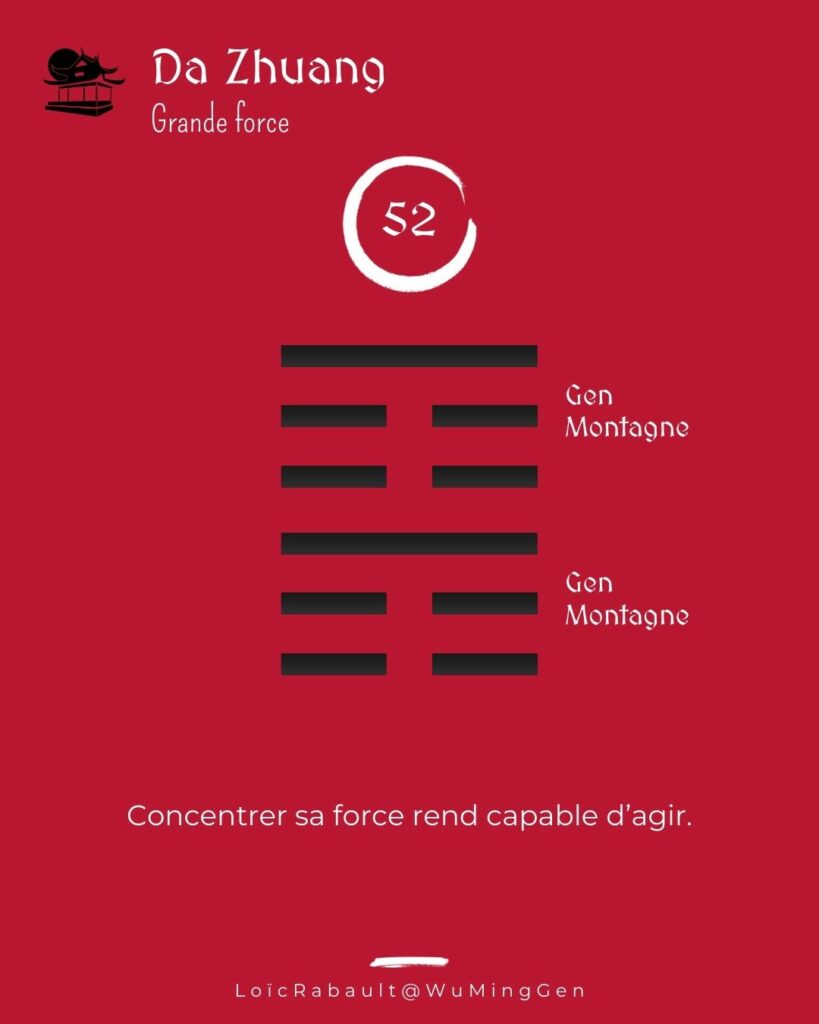 Grande force : c’est maîtriser son énergie. Une grande puissance implique le besoin d’être capable de la canaliser. C’est l’expression de la poussée du Yang, majoritaire sans être excédentaire. La véritable force ne consiste pas à avoir une énergie puissante et excédante, mais à savoir dompter cette poussée d’énergie pour la rendre féconde. Ceci s’opère à la faveur de n’énergie Yin qui vient réguler l’énergie Yang pas la modération et le respect des usages. La grande vitalité du Yang déploie toute son efficacité lorsqu’on n’abuse pas de l’aisance qu’elle procure. Pour accompagner la puissance du Yang, il faut agir de manière harmonieuse, sans forcer, mais de manière régulière. Le principal danger est la fatigue qui guette par grande dépense d’énergie et les blessures qui s’en suivent. Ténacité profitable. Savoir faire preuve d’endurance pour ne pas faiblir dans la tâche.